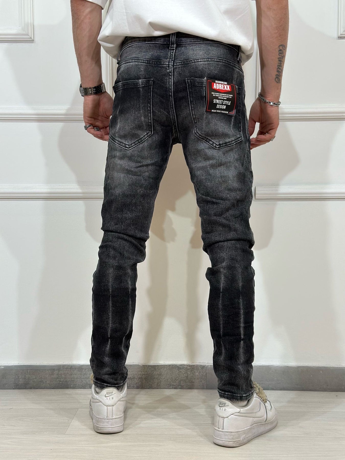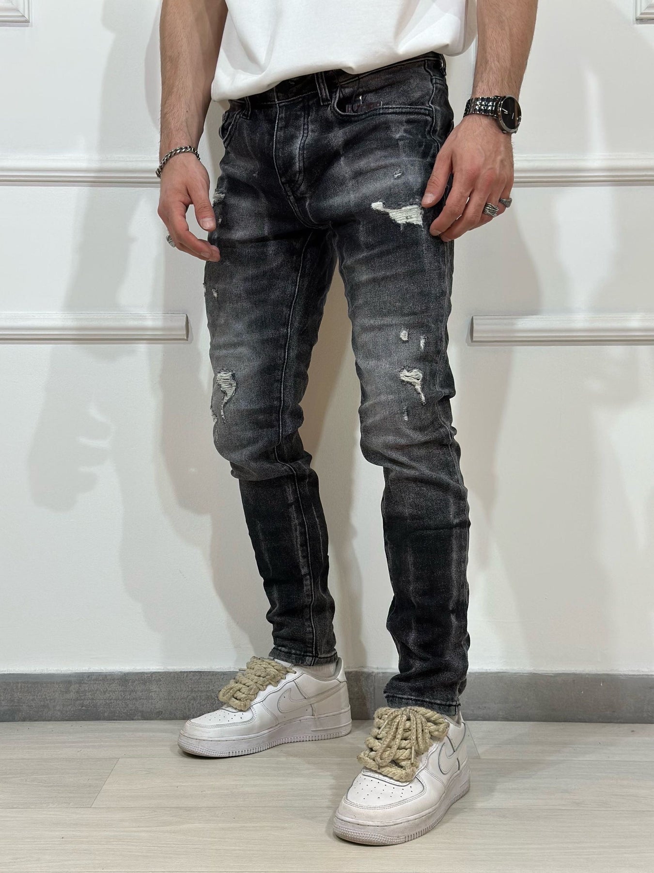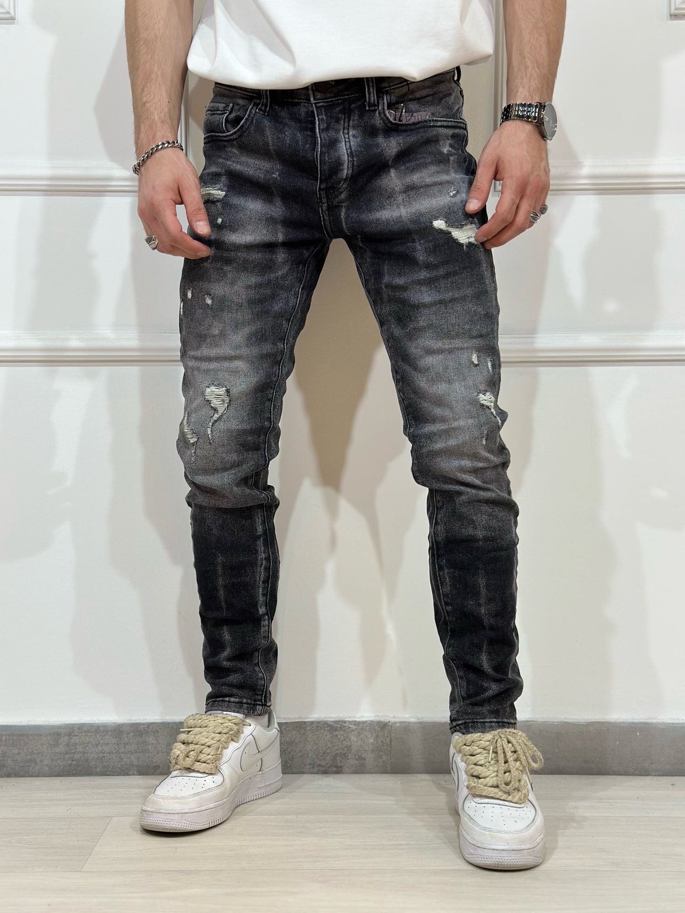 Jeans skinny denim con rotture uomo