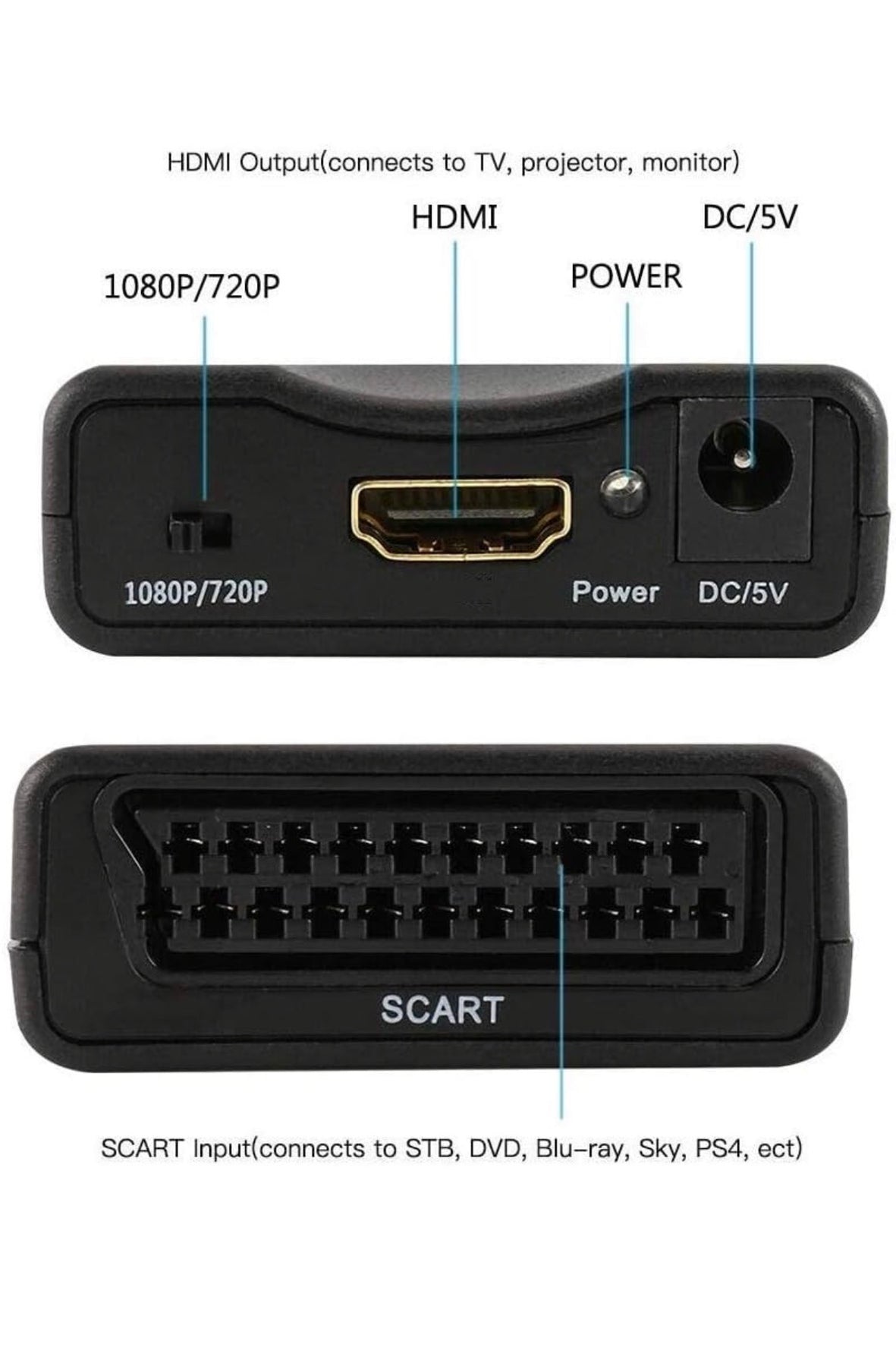 formato di ingresso scart: standard tv pal, ntsc3.58, ntsc4.43, secam, pal / m, pal / n, adatto per dvd / sky box / n64 / vhs / ps4 / vcr / wii, ecc. hdmi formato di output: compatibile con hdmi1.3, supporta l'uscita 720p /1080p, adatto per hdtv, proiettore, display, ecc."