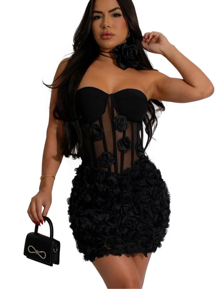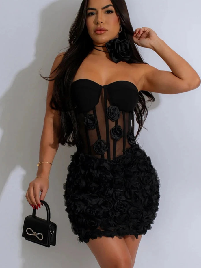 3D Flower See Through Strapless White Mini Dresses - black dress / XL- MUST HAVE| badpeople.it