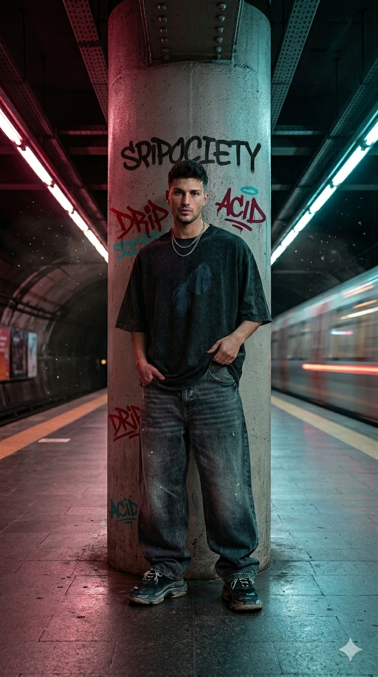 Consiglio: per un fit streetwear autentico scegli una taglia in più — più largo sulle spalle e sul busto, ma sempre con linee pulite e proporzionate 👕🩳
